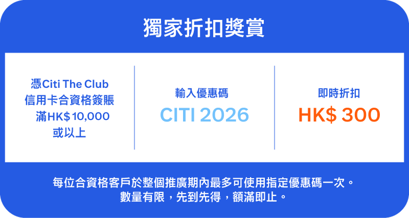 及 條件2: 於The Club 網上平台的付款頁面成功輸入下方指定優惠碼「CITI2026」進行符合資格1的合資格交易;合資格簽賬金額(HK$) 即時折扣額 (HK$) 指定優惠碼 整個推廣期內優惠碼限額 10,000 或以上 300 CITI2026 300